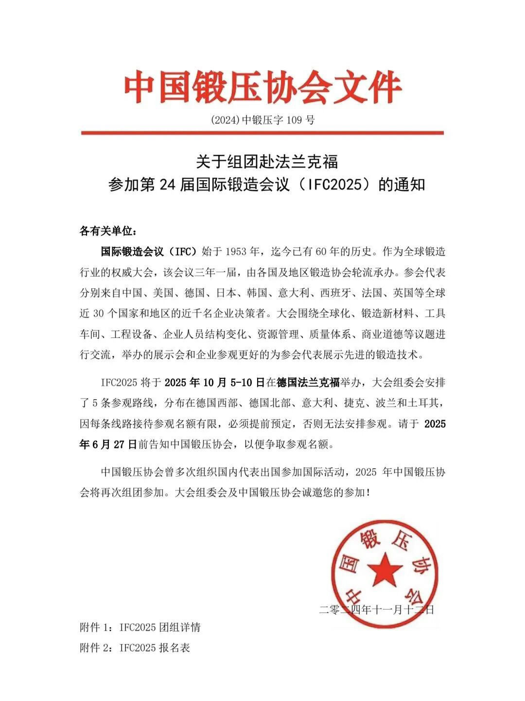 2025年10月5-10日,全球鍛造行業(yè)***高規(guī)格的盛會(huì)——第24屆國(guó)際鍛造會(huì)議在德國(guó)法蘭克福隆重舉行。作為全球鍛造界的"奧運(yùn)會(huì)",IFC2025匯聚了來(lái)自30個(gè)國(guó)家的近百名行業(yè)***。我司憑借在精密鍛造領(lǐng)域的技術(shù)實(shí)力和市場(chǎng)影響力,榮幸獲得中國(guó)鍛壓協(xié)會(huì)正式邀請(qǐng),總經(jīng)理高仕恒代表公司隨中國(guó)代表團(tuán)參會(huì),與全球鍛造精英共話行業(yè)未來(lái)。